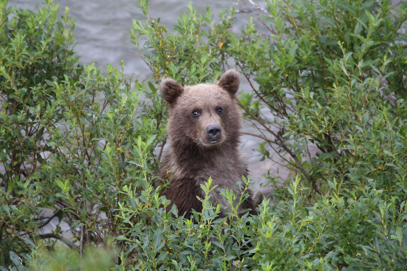 Doch wie aus dem nichts und ohne dass man vorher etwas gehört oder bemerkt hatte, rannte erst ein mittelgroßer Grizzly und gleich danach ein zweiter direkt neben uns aus dem Gebüsch ins Wasser. Ich konnte gerade noch zwei Aufnahmen machen. Dann kam mir der Gedanke durch den Kopf, bei zwei Jungbären, da ist auch eine Mutter dabei. Habe meine Kamera auf den Boden gelegt, hab automatisch eine Handbewegung gemacht, mich geduckt und in Ruhe und gleichzeitig mein Bärenspray gezogen und gewartet, was passiert. Der Pilot und der Begleiter haben wohl das gleiche gedacht wie ich. Jeden Moment kommt die Bärin aus dem Gebüsch zu ihren Jungen. Meine Halsschlagader wurde doppelt so dick vor lauter Anspannung. Aber nichts passierte, alles blieb ruhig. Ich habe dann die Kamera wieder aufgehoben und habe die zwei jungen Grizzlys dann im Flusswasser aufgenommen, wie sie gespielt haben und beide sind dann am anderen Ufer weiter den Fluss entlanggelaufen. Das war mein erstes High-light an diesem Tag. Wir sind kurze Zeit danach zurück auf die Ebene und haben uns dort an einem Platz niedergelassen, von dem man die Sandbank sehr gut sehen konnte. Haben dort ungefähr 30 Minuten verbracht. Nichts war zu sehen – alles war ruhig.