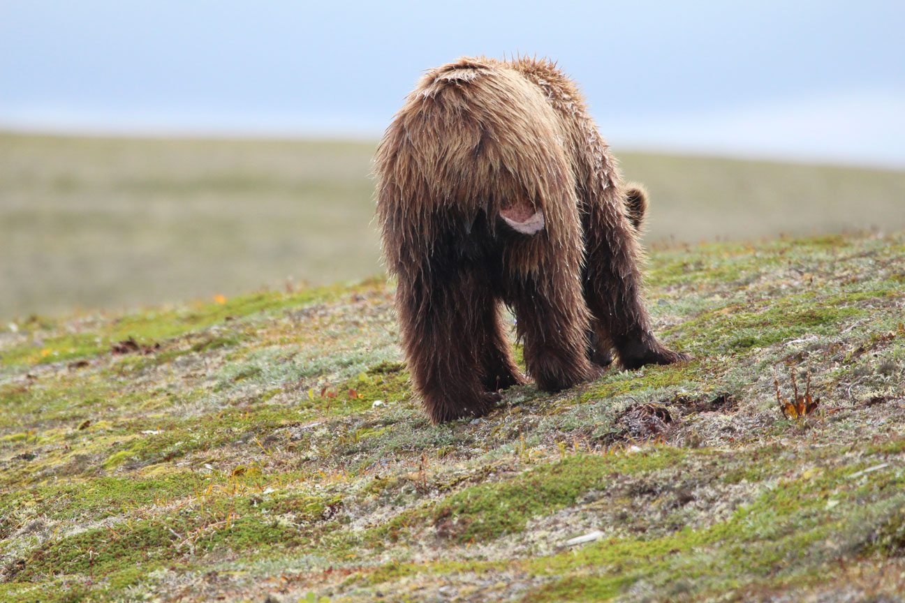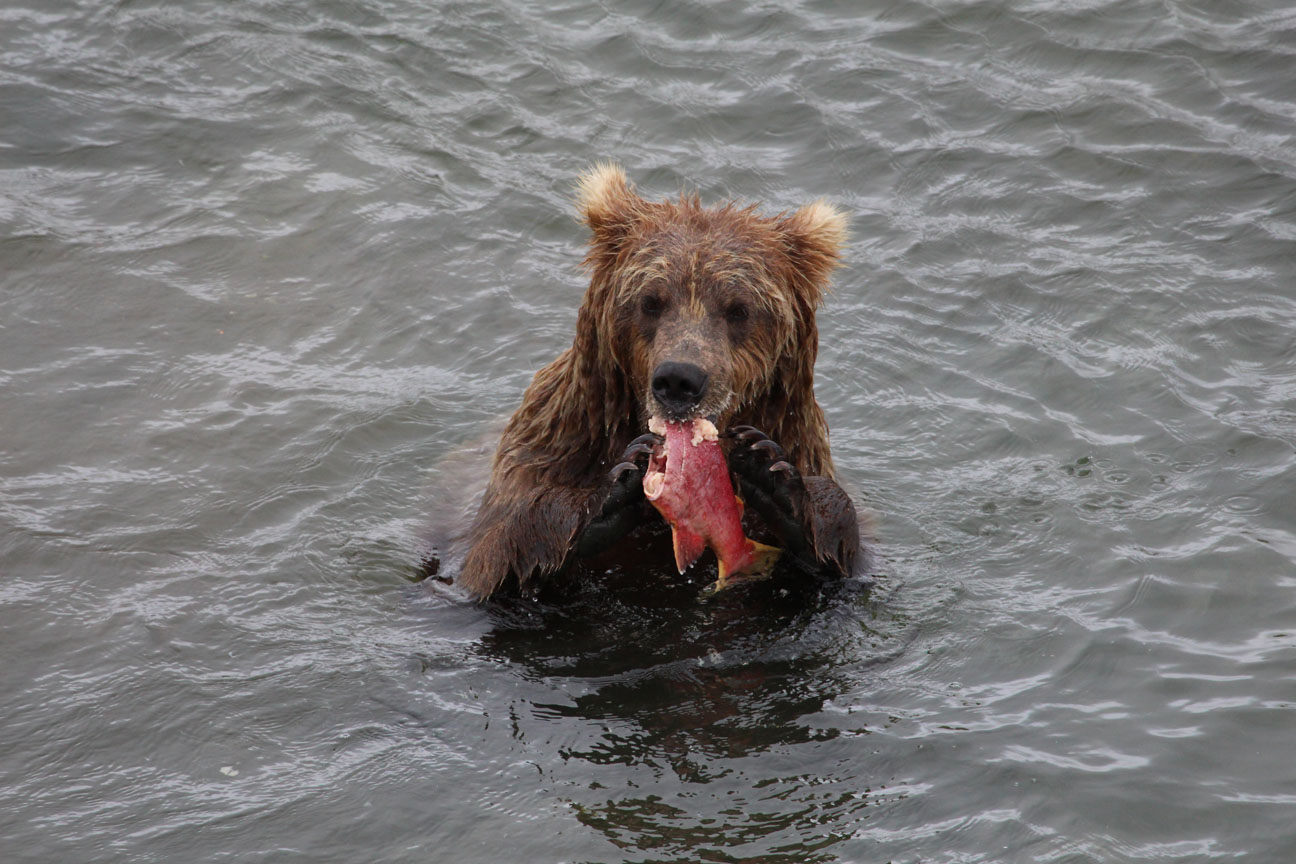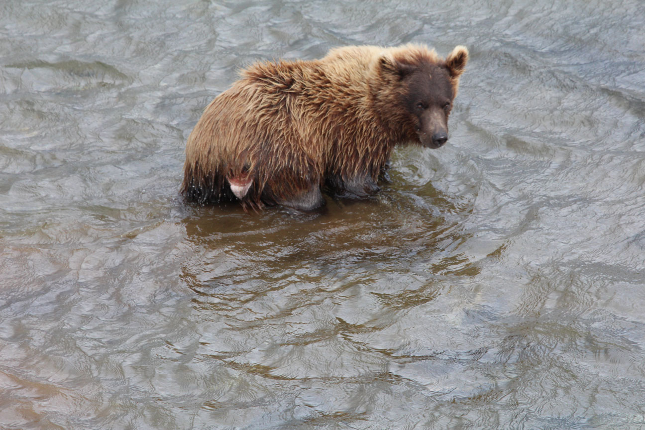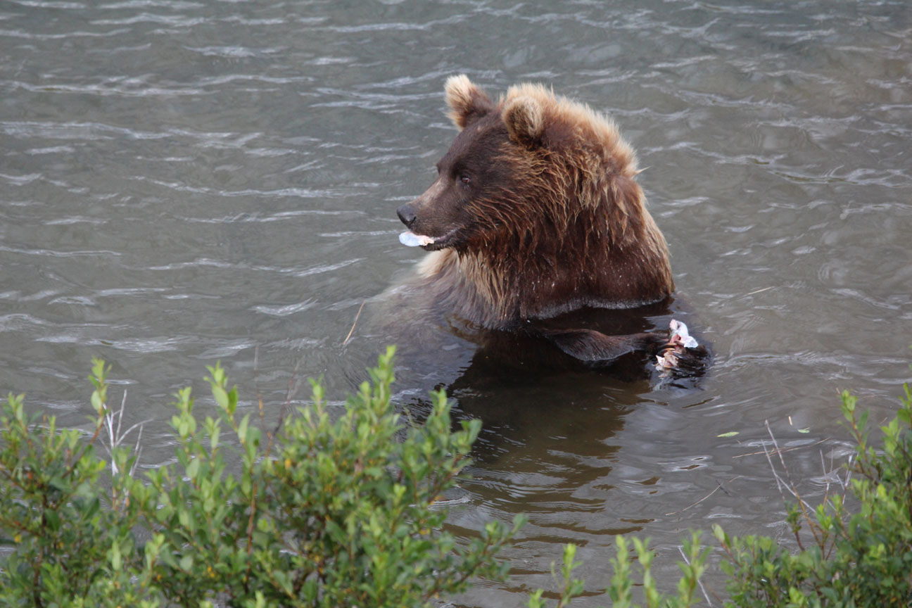 Auf der anderen Seite des Flusses sah man einen Grizzlybär, der Richtung Fluss gelaufen kam. Der Grizzly kam immer näher und wurde immer größer. Am Plateaurand angekommen, peilte er erst mal die Lage. Man konnte richtig sehen, dass er erst einmal alles genau ausspähte. Er setzte sich hin und beobachtete die Umgebung eine ganze Weile. Dann stieg er hinunter zum Fluss. Hier fraß er einen Lachs und dort einen Lachs und kam uns immer näher. Er schaute mal zu uns rüber, aber er ignorierte uns gleich wieder und watschelte weiter den Fluss entlang.