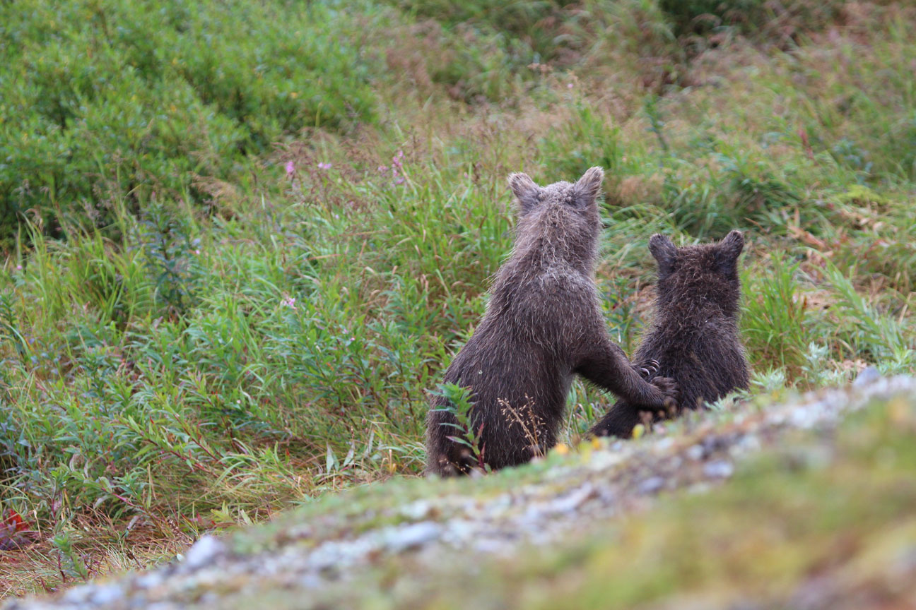 Das war es für heute, dachte ich, da kommt nichts mehr. Doch man wundert sich immer wieder. Aus dem nichts hörte man richtig lautes Bärengeschrei - so richtig laut und aggressiv. Auf dem Plateau auf der anderen Seite standen zwei große Grizzlys, die aufeinander zuliefen und brummten, sich auf die Hinterbeine stellten und übereinander herfielen.
